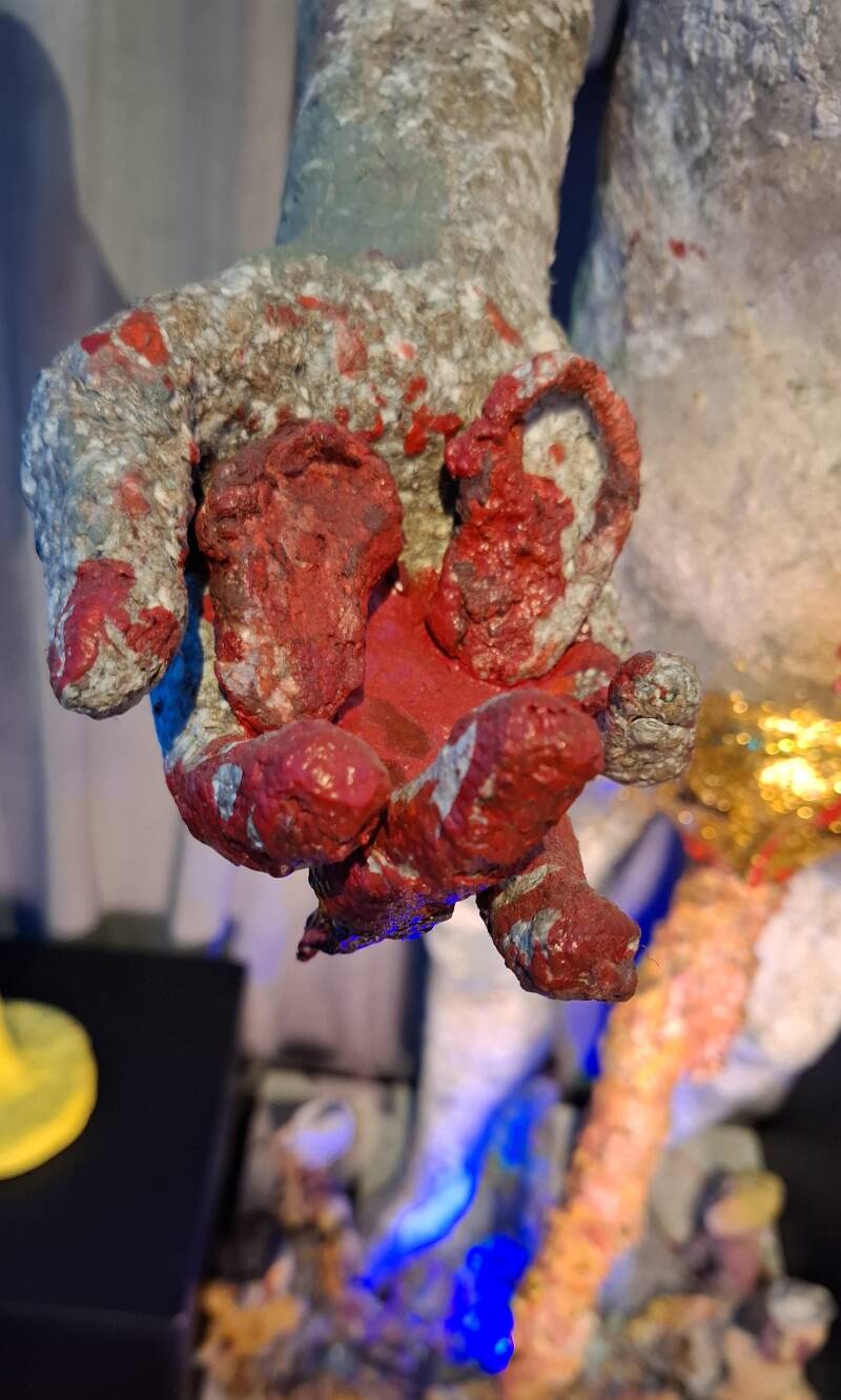 Diese Skulptur ist ein Unikat, gefertigt aus recyceltem Altpapier, Leim, alten CDs, Spitze, Farbe, Glitzer und LED-Licht. Ein zentrales Materialelement ist mein eigenes Blut, das ausschließlich zu künstlerisch-symbolischen Zwecken eingesetzt und steril sowie fachgerecht von einer approbierten Ärzt*in abgenommen wurde.