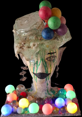 Dieses Werk zeigt einen menschlichen Kopf als leuchtende Mixed-Media-Skulptur aus recycelten Materialien, transparenten Bruchstücken und integrierten Lichtquellen. Die Form ist bewusst roh und unperfekt gehalten, die Oberfläche wirkt geflickt, geschichtet und verletzlich. Der Kopf trägt eine Krone aus farbigen Kugeln sowie ein Feld aus leuchtenden Elementen im Sockel, die das Objekt von innen heraus erhellen. Die Augen sind transparent, der Mund dunkel und reduziert, die Gesichtszüge stilisiert und fragmentarisch. Das Zusammenspiel aus fragiler Materialität und intensiver Farbigkeit erzeugt einen Kontrast zwischen Zerbrechlichkeit und Präsenz. Das Werk thematisiert den menschlichen Körper als Träger von Erfahrung, Erinnerung und innerem Zustand und übersetzt emotionale, biografische und gesellschaftliche Prozesse in eine visuelle, körperliche Form. Die Lichtquellen fungieren nicht nur als ästhetisches Element, sondern als integraler Bestandteil der Skulptur und verleihen ihr eine symbolische Dimension zwischen Sichtbarkeit, Verletzlichkeit und innerem Weiterleuchten.