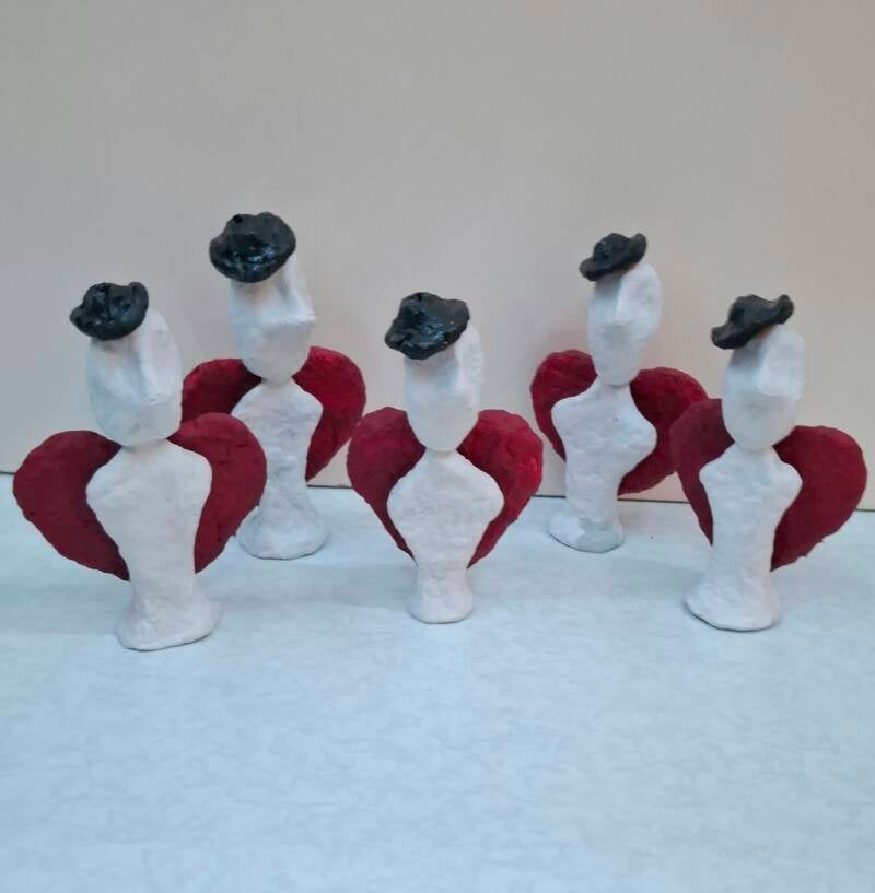Die weißen, reduzierten Figuren stehen auf den Plattformen wie gedankliche Protagonist*innen. Sie tragen jeweils ein leuchtend rotes Herz auf dem Rücken – kein Ornament, sondern Ausdruck innerer Beweggründe: Gefühle als Träger von Erkenntnis. Die Herzdenker entstanden in Momenten des Innehaltens, während die Künstlerin im „Stewuki-U-Boot“ saß und nachdachte. Jeder einzelne ist ein Gedanke, der aus Empathie und innerer Wahrnehmung gewachsen ist.