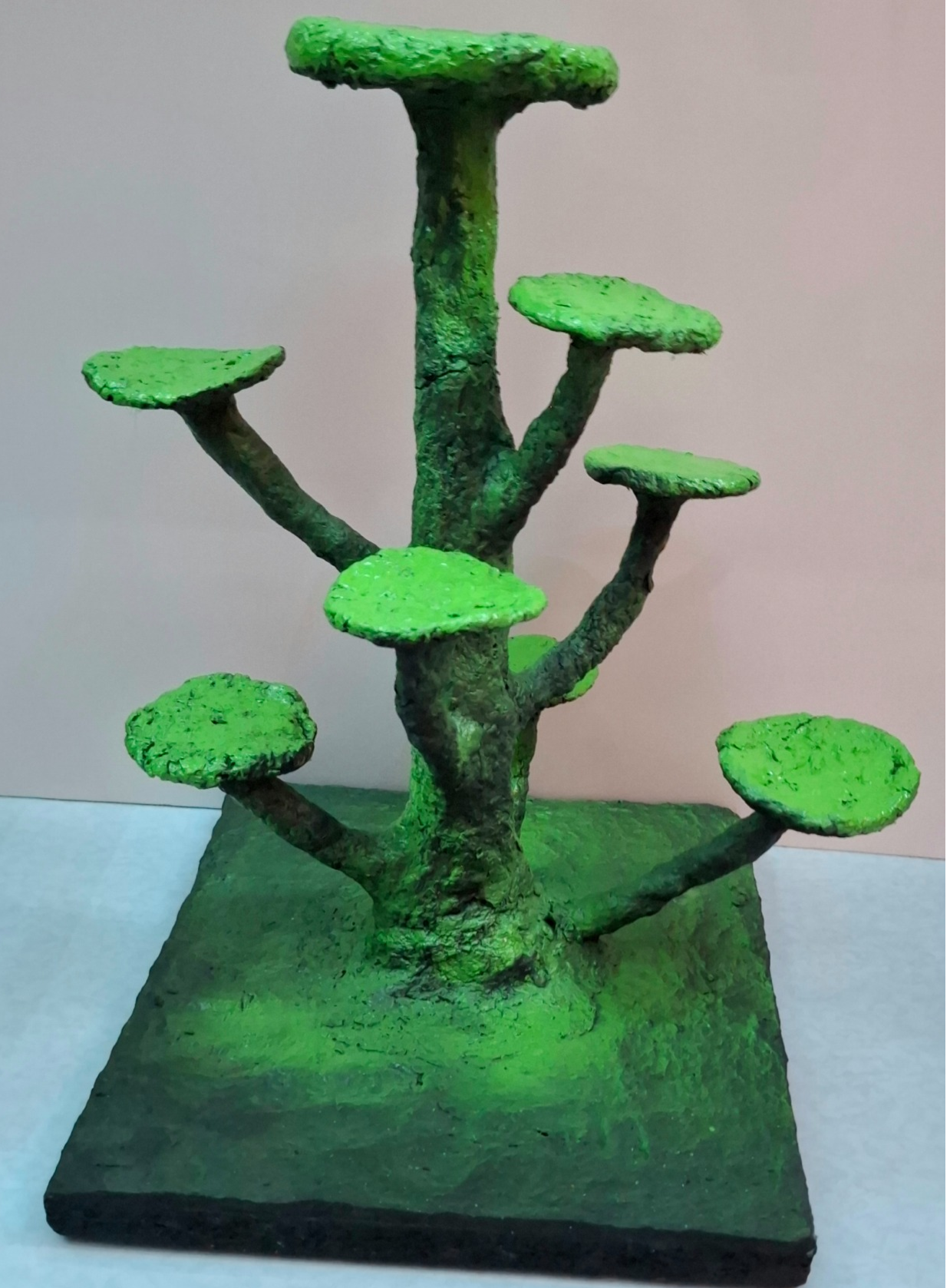 Die Baumstruktur und die Figuren wurden aus Pulp gefertigt – einer Papiermasse aus Altpapier und Leim, die in Handarbeit aufgebaut wurde. Diese handmodellierte Oberfläche zeigt Spuren des künstlerischen Prozesses: unregelmäßig, lebendig, organisch. Die Farbgebung besteht aus lebendigen Grün-, Weiß- und Rottönen – eine reduzierte, aber wirkungsvolle Palette, die symbolisch aufgeladen ist.