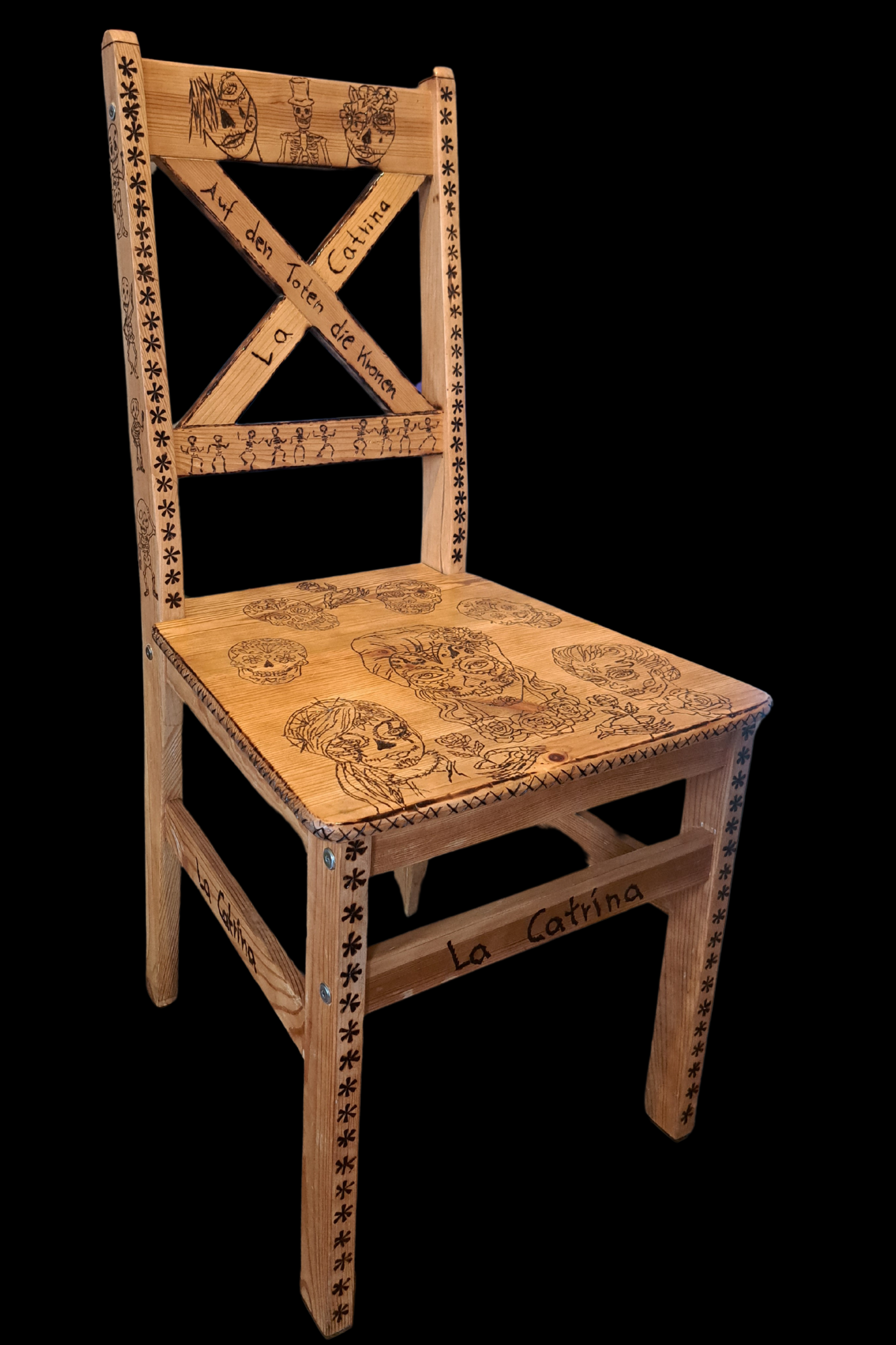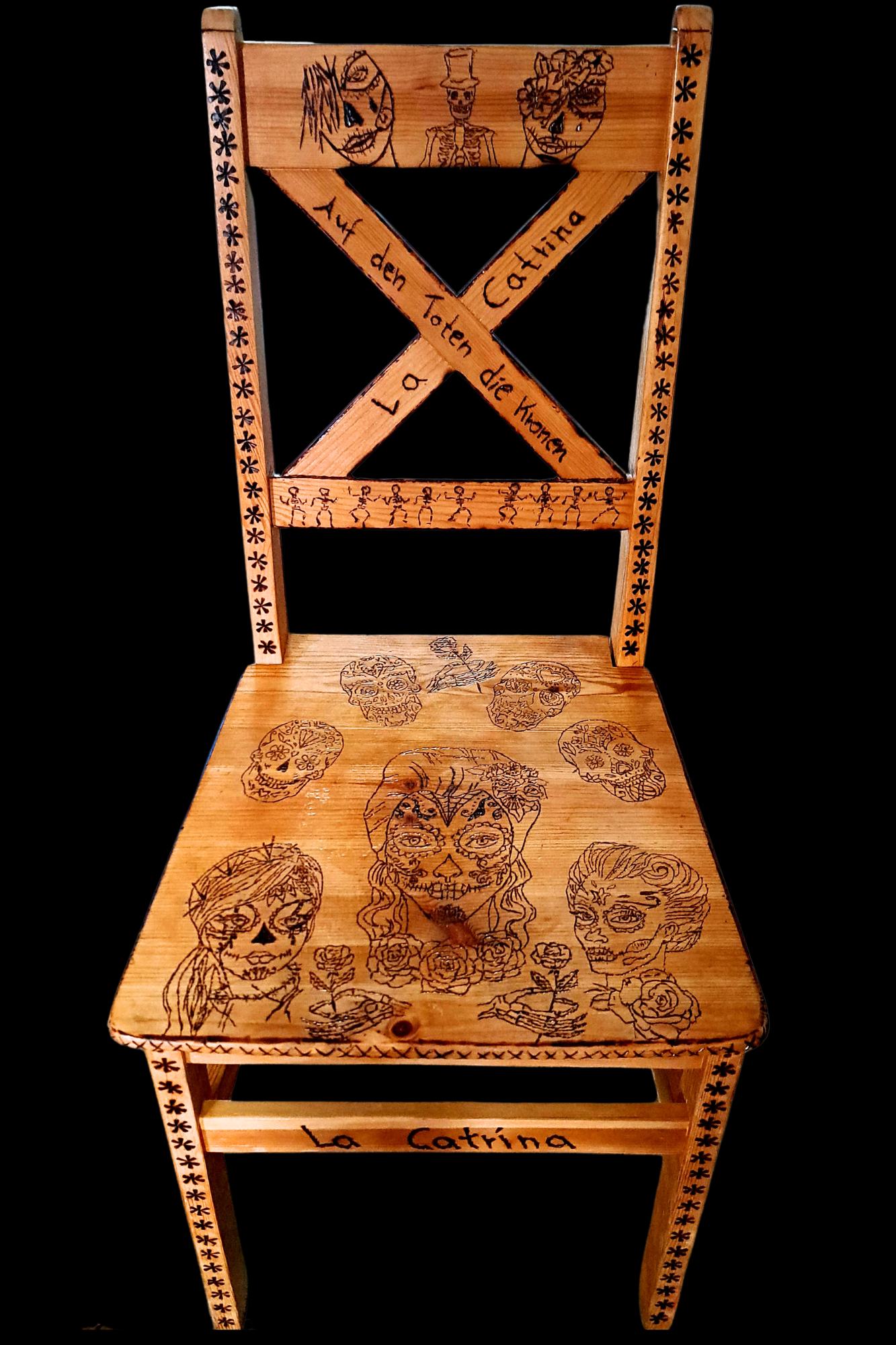 Dieser "La Catrina" Stuhl ist ein von Hand gefertigtes Unikat, geschaffen mit der Technik der Brandmalerei. Diese Kunstform verleiht dem Holz eine einzigartige Tiefe und Textur, wodurch jede Linie und jedes Detail zum Leben erweckt wird. Die Liebe zum Detail und die handwerkliche Präzision machen dieses Kunstwerk zu etwas Besonderem.