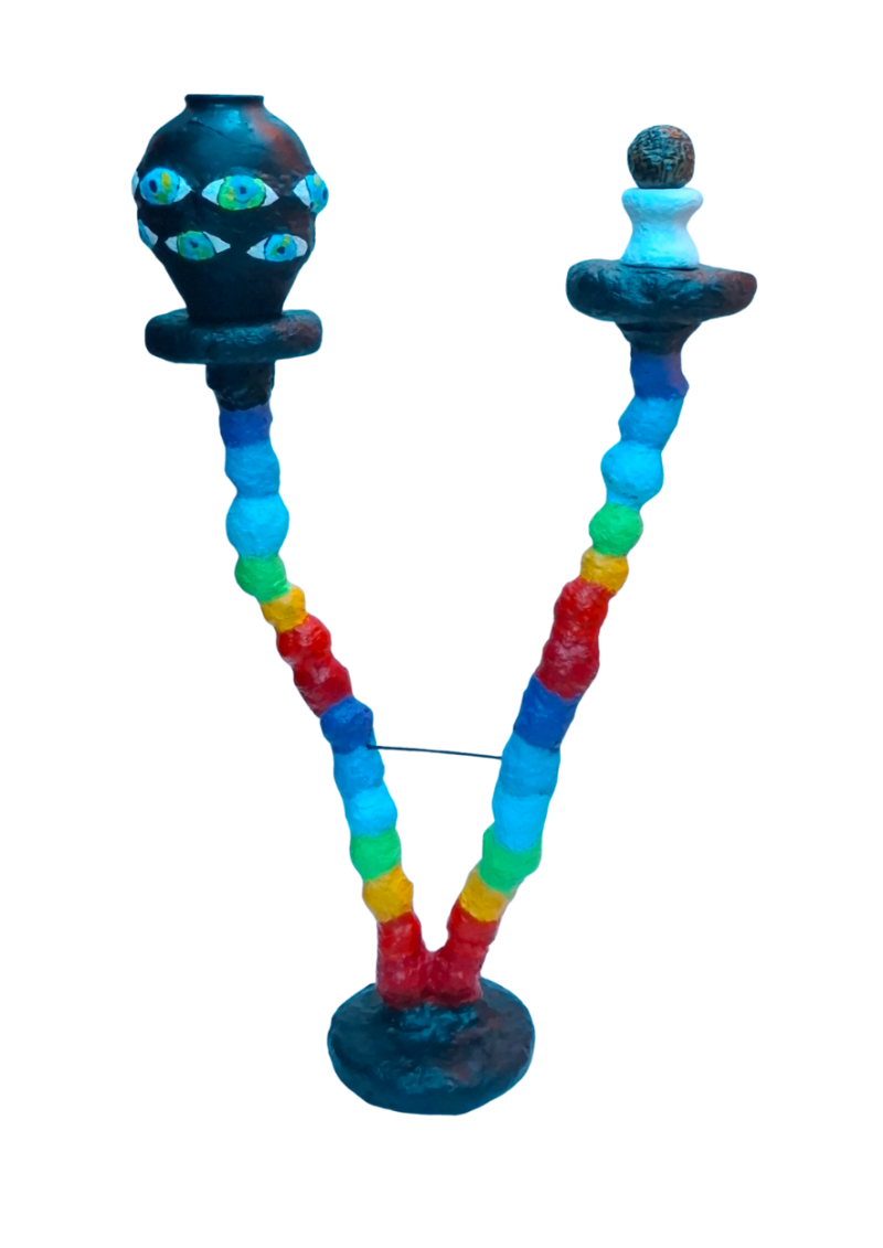 „Rundumblick“ ist eine Skulptur über Sichtbarkeit, Verantwortung und die Frage, wie Gesellschaft und Systeme mit Identität umgehen. Das gesamte Werk besteht vollständig aus recyceltem Material – Altpapier und Leim –, wodurch es nicht nur eine symbolische Geschichte erzählt, sondern auch physisch verkörpert, was Transformation bedeutet: Aus Weggeworfenem entsteht etwas Neues, Bedeutungsvolles, Tragendes. Die Vase auf der linken Seite trägt rundherum Augen. Diese Augen stehen nicht für Kontrolle, sondern für Achtsamkeit. Sie zeigen, wie ein System eigentlich sein sollte: aufmerksam, präsent und ohne blinde Flecken. Ein ideales System müsste nicht erst die Perspektive wechseln oder sich bewegen, um zu erkennen, wenn jemand aus dem Blick fällt – es müsste von sich aus in alle Richtungen sehen können. Es müsste wahrnehmen, ohne dass jemand schreit. Es müsste verstehen, bevor jemand zerbricht. Die Vase symbolisiert damit ein System, das niemanden verliert und niemanden übersieht, weil es so gestaltet ist, dass es alles im Blick hat. Auf der rechten Seite befindet sich die Kugel, deren Oberfläche ein Labyrinth trägt. Dieses Labyrinth steht für die Identität eines Menschen: verwinkelt, individuell, voller Wege und Abzweigungen. Identität ist niemals einfach. Sie ist nicht linear, nicht klar zu lesen, nicht schnell zu begreifen. Sie ist ein innerer Raum, der aus Erfahrungen, Verletzungen, Hoffnung, Entwicklung und Selbstfindung besteht. Die Kugel erinnert daran, dass jeder Mensch sein eigenes, komplexes Labyrinth in sich trägt – und dass kein System, keine Behörde, keine gesellschaftliche Struktur das Recht hat, diese Identität zu vereinfachen oder zu ignorieren.