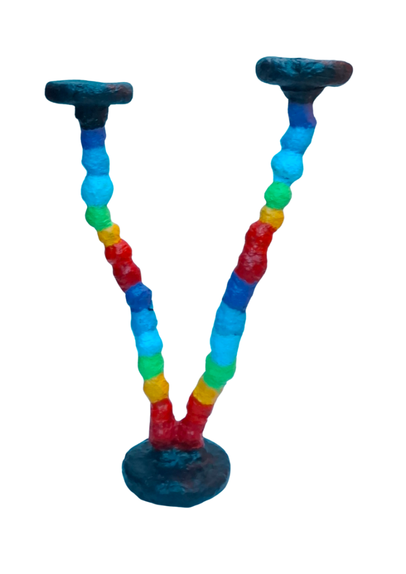 Die beiden farbig gestalteten Säulen, die Vase und Kugel tragen, entspringen derselben Basis. Ihre unteren Segmente sind in den sieben Farben der Chakren gestaltet – von Rot bis Violett. Diese bewusste Gestaltung zeigt, dass sowohl der Mensch als auch das System auf denselben energetischen Grundprinzipien ruhen: Stabilität, Kreativität, Macht, Herz, Ausdruck, Intuition und Bewusstsein. Die Chakren repräsentieren die fundamentalen Ebenen des Menschseins, auf denen Identität entsteht und auf denen Systeme wirken sollten. Die Säulen selbst symbolisieren zwei Lebensrealitäten: die des Individuums und die des Systems. Beide haben denselben Ursprung, wachsen aber in unterschiedliche Richtungen. Der Mensch entwickelt seine Identität, sucht seinen Weg, kämpft mit seinem inneren Labyrinth. Das System hingegen hat die Aufgabe, zu tragen, zu schützen und präsent zu bleiben – und zu sehen. Die zentrale Aussage des Kunstwerks lautet: Ein System darf niemanden aus dem Blick verlieren. Es darf nicht zulassen, dass Identität unsichtbar wird, nur weil sie komplex ist oder nicht der Norm entspricht. Ein gutes System erkennt selbst dann, wenn eine Identität fällt, stolpert oder hinter etwas verschwindet, dass sie dennoch existiert. Es sieht hin, egal wie leise jemand geworden ist. Es nimmt wahr, auch wenn jemand nicht in traditionellen Mustern lebt, liebt oder spricht. Und es reagiert, ohne dass man darum bitten muss. In einer Zeit, in der viele Menschen von Institutionen übersehen werden – sei es wegen ihrer Identität, ihrer psychischen Situation, ihres Geschlechts, ihrer Herkunft oder ihrer Lebensumstände –, stellt „Rundumblick“ die Frage, ob unsere Strukturen wirklich so aufmerksam sind, wie sie sein müssten. Das Kunstwerk erinnert daran, dass Identität immer voraussetzt, gesehen zu werden. Und dass es die Verantwortung aller Systeme ist, diese Sichtbarkeit nicht nur zu ermöglichen, sondern aktiv zu gewährleisten. Es fordert dazu auf, genauer hinzusehen, die Perspektive zu erweitern und die Vielfalt menschlicher Identität nicht nur zu akzeptieren, sondern zu schützen. „Rundumblick“ ist ein Appell an eine Gesellschaft, die verstehen muss, dass ein Mensch nicht verloren geht, weil er fällt – sondern nur dann, wenn niemand hinschaut.