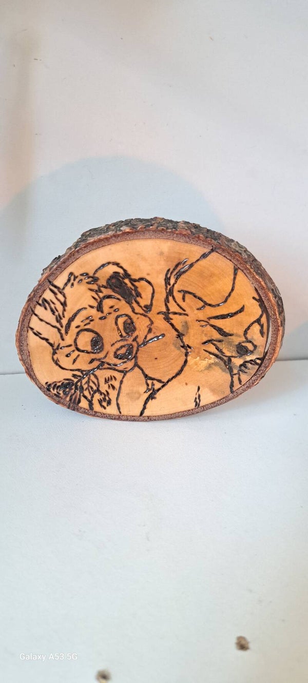 Diese einzigartige Holzscheibe wurde liebevoll aus einer kleinen Scheibe Holz mit einem Durchmesser von 9,5 cm gefertigt. Diese ist handgefertigt und somit ein Unikat, das es so kein zweites Mal gibt.