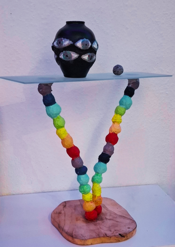 Die Skulptur wird von zwei Beinen getragen, die jeweils aus 14 Kugeln bestehen. Diese Kugeln sind in den sieben Farben der Chakren gestaltet, die zusammen für Balance, Energiezentren und spirituelle Entwicklung stehen. Die beiden Beine, die sich von der Basis aus in einem V-förmigen Winkel nach oben strecken, symbolisieren sowohl Stabilität als auch Dynamik. Sie tragen das Werk und verbinden das Individuelle (die Kugel) und das Kollektive (die Vase) miteinander.