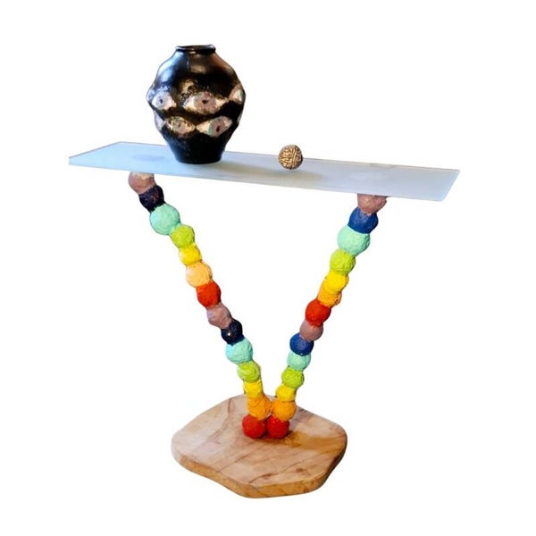 Die Basis des Werkes ist eine Holzplatte, die für Erdung, Natur und die fundamentale Verbindung des Menschen zur Welt steht. Die natürliche Maserung des Holzes kontrastiert mit den farbenfrohen Kugeln und erinnert daran, dass alle Menschen in der Natur verwurzelt sind, während sie ihre individuelle Reise antreten.