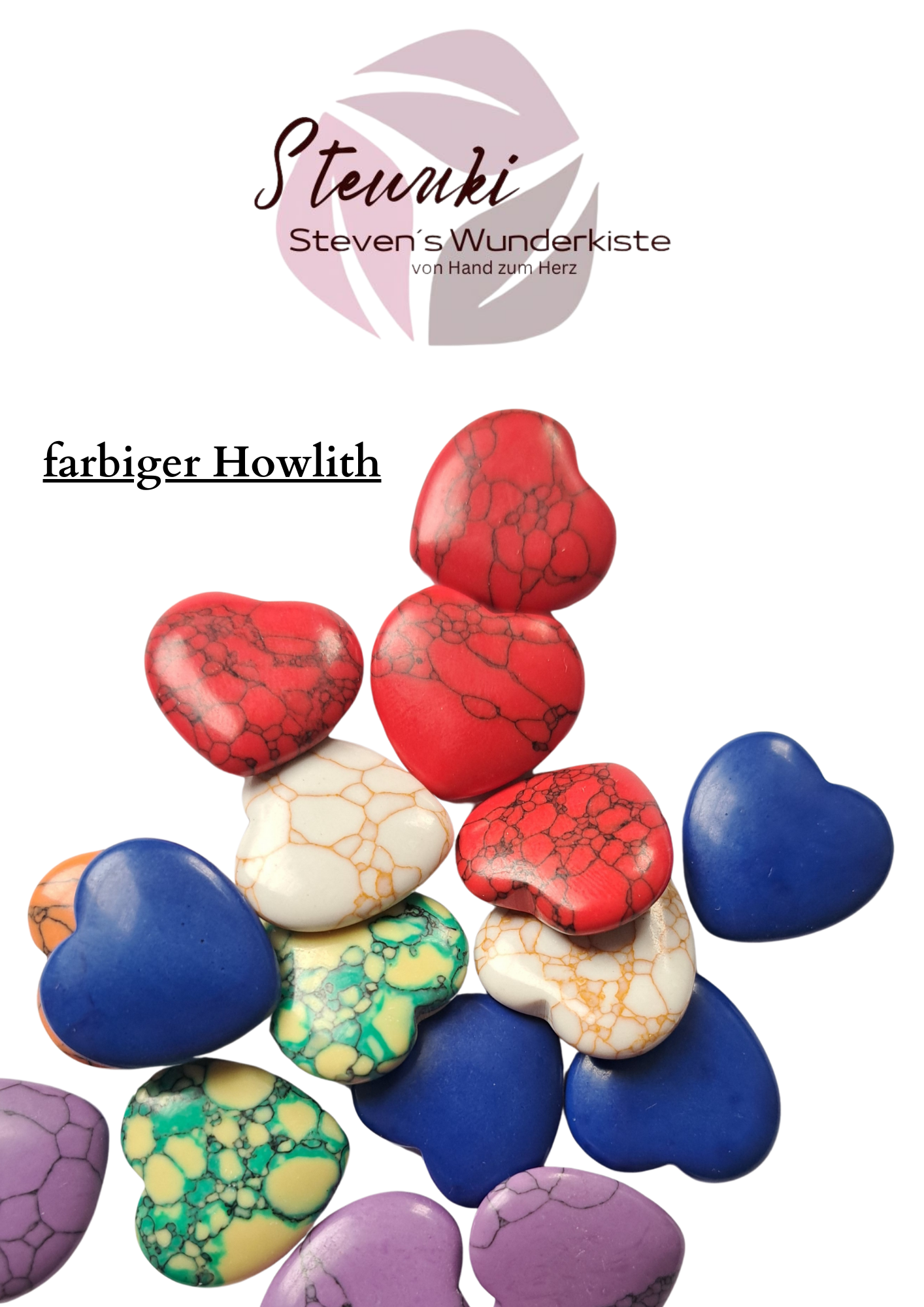Howlith, auch bekannt als Howlith, ist ein häufig vorkommendes Mineral, das für seine weiße bis elfenbeinfarbene Grundfarbe und seine Adern oder Flecken in verschiedenen Farben bekannt ist, darunter blau, grün, rot und schwarz. Diese Farbvariationen entstehen durch verschiedene Mineralien, die in das Howlithgestein eingebettet sind. Howlith wird häufig für Schmuck und Dekoration verwendet und ist aufgrund seiner auffälligen Musterung und seiner Härte beliebt. Es wird auch oft gefärbt, um es wie andere, seltenere Edelsteine aussehen zu lassen.